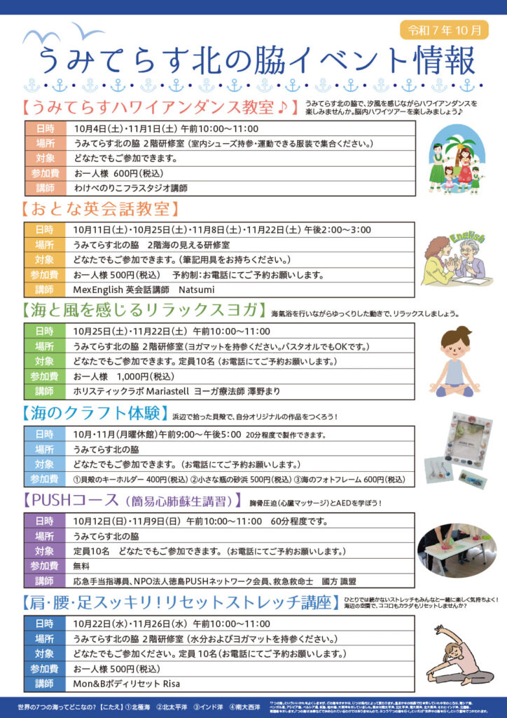 うみててらす北の脇では、いろいろなイベントや教室を実施いたします。